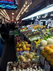 Having retrieved all of our travelers and their  bags, we spent the afternoon in Seattle.  Our last stop, before heading across the water to our weekend home, was at Pike’s Market which boasts tantalizing displays of fresh produce, flowers and fish.